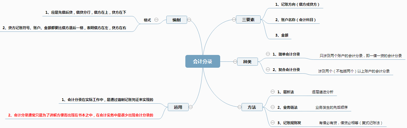 会计分录是指对某项经济业务标明其应借应贷账户及其金额的记录,亦称“记账公式”,简称“分录”。 会计分录是由应借应贷方向、对应账户(科目)名称及应记金额三要素构成。它根据复式记账原理的要求,对每笔经济业务列出相对应的双方账户及其金额的一种记录。在登记账户前,通过记账凭证编制会计分录,能够清楚地反映经济业务的归类情况,有利于保证账户记录的正确和便于事后检查。每项会计分录主要包括记账符号,有关账户名称、摘要和金额。会计分录分为简单分录和复合分录两种。简单分录也称“单项分录”。是指以一个帐户的借方和另一个账户的贷方相对应的会计分录。复合分录亦称“多项分录”。是指以一个账户的借方与几个账户的贷方,或者以一个账户的贷方与几个账户的借方相对应的会计分录。为了保证账户对应关系的正确、清晰、便于了解经济业务的内容,会计分录必须严格掌握一借多贷或一贷多借的基本原则,不允许多借多贷。