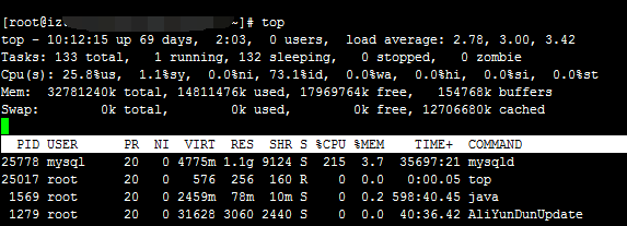 up 69 days, 2:03 ,表示上线运行69天2小时3分钟 未重启过服务器;