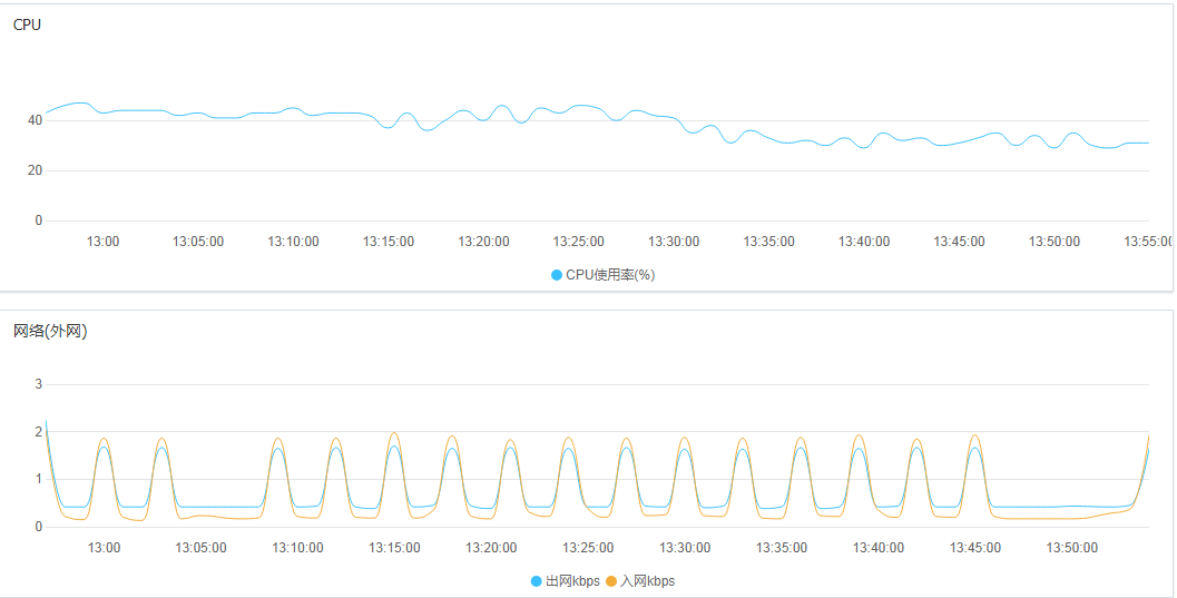 最近几天发现有一台阿里云服务器老是在晚上出现告警,一般都是CPU高于阀值,所以就检查一下日志排查一下问题,在排查过程中发现一些有意思的情况,比如CPU和网络使用是有规律的抖动: