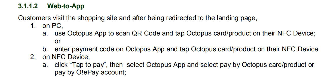- 2、Web To App :这个是消费者在商家网站上购物选择八达通后先出现二维码,消费者使用八达通app扫码再在NFC手机背后刷八达通卡完成支付,这个很奇怪后面重点介绍一下。