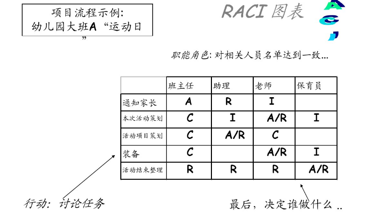 每一个项目成员都会被四个字母中的至少一个标示,从而使他们明白在各个子流程中的职责。此时作用范围仅限于个人。