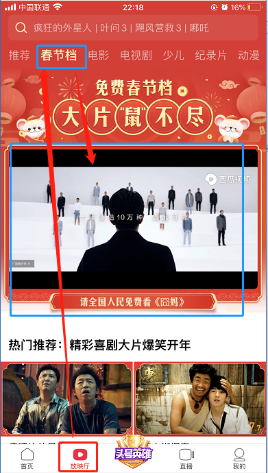 如果是西瓜视频APP则在:放映厅》春节档》请全国人民免费看囧妈里面: