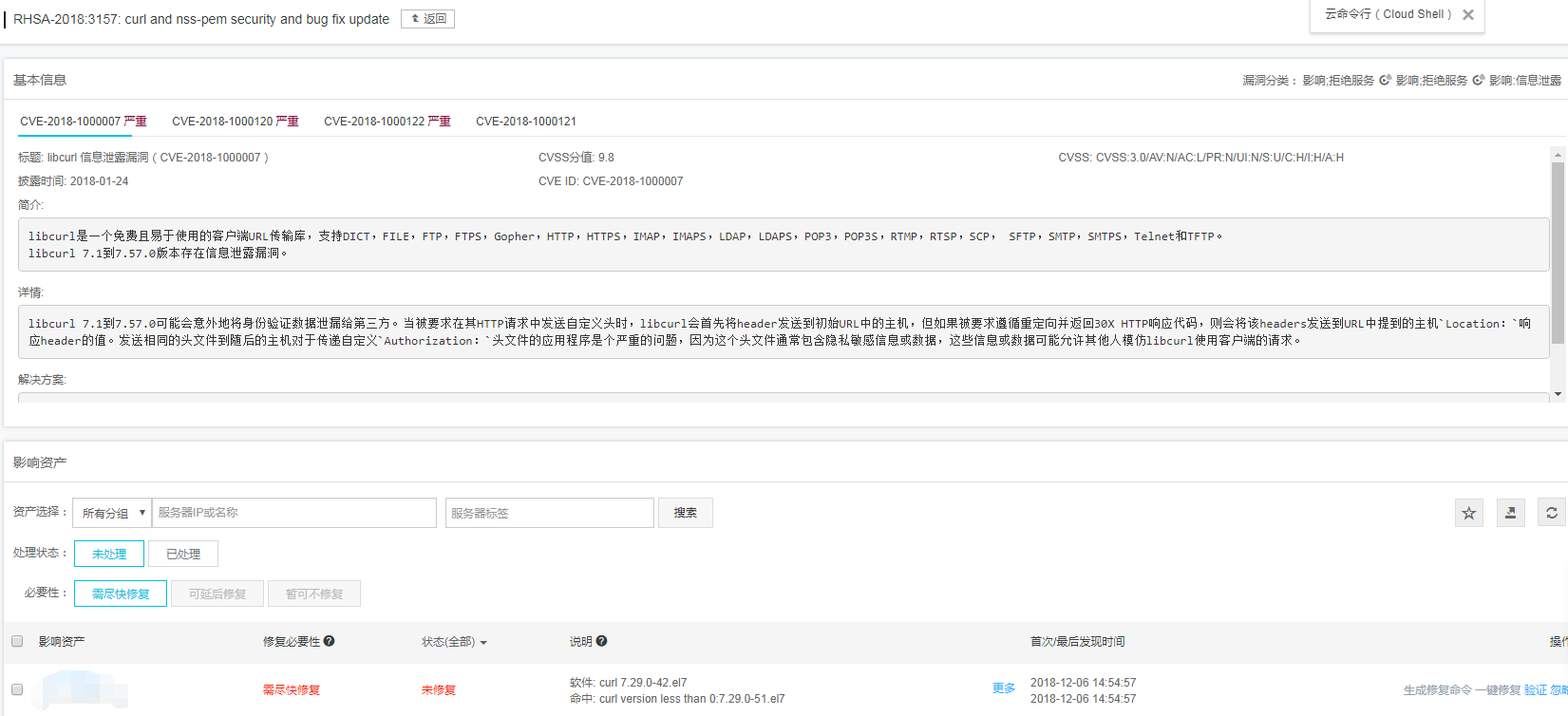 阿里云ECS管理后台提示服务器有RHSA-2018:3157: curl and nss-pem security and bug fix update漏洞,需要修复。