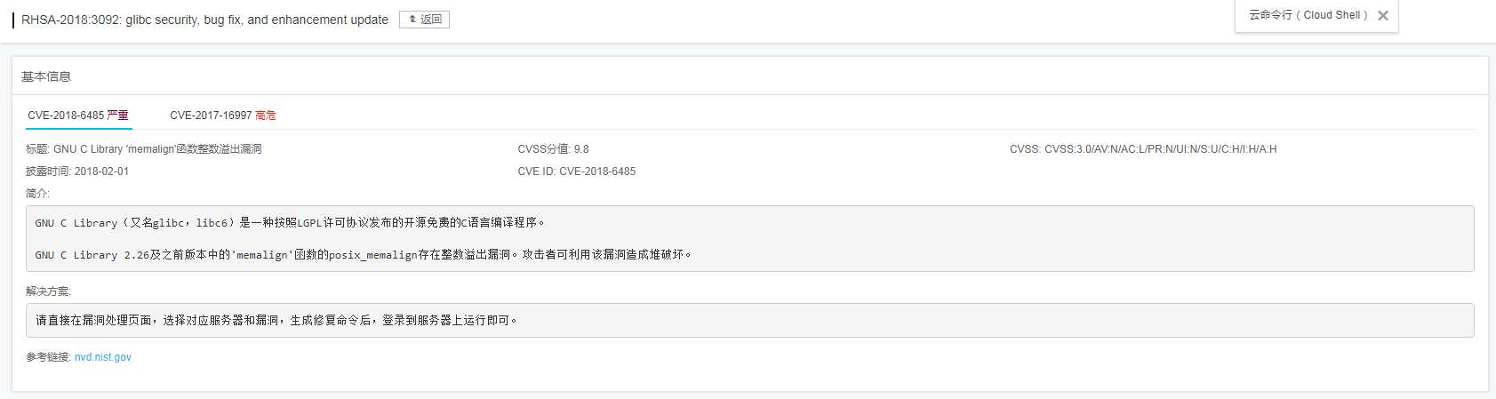 您现在的位置是:首页 > 云笔记 > 开发随笔 > 文章详情 阿里云RHSA-2018:3092: glibc security, bug fix, and enhancement update漏洞修复 admin 2018-12-07 18:21:56 539人已围观 阿里云后台提示的漏洞基本信息如下:修复命令: yum update glibc执行完成后去控制台验证一下即可。 分享到: 编辑发布时间:2018-12-07 18:21:56 标签云 自媒体类 阅读笔记 文件 我的文章 专业学习 财务相关 英语学习 开发笔记 金融授信 商城商品 开发随笔 产品设计 人工智能 人生目标 投资赚钱 支付公司 跨境供应链 管理笔记 国际物流 SEO学习 网络赚钱 营销推广 支付研究 商业模式 励志语录 抖音学习 支付体系 运维技术 生物技术 跨境电商 点击排行榜 支付行业常用名词术语解释 备付金存管银行是指可以为支付机构办理客户备付金的跨行收付业务,并负责对支付机构存放在所有备付金银行的客户备付金信息进行归集、核对与监督的备付金银行。(支付机构客 一元购模式分享 首先需要知道什么叫一元购? 就是你支付一元后获得一个购物资格,有的叫抽 CentOS服务器上mysql数据库优化过程分析(一) 最近有一套生产系统的数据库CPU老是偏高,发现闲时也在40%-60%左右,感觉很不正常,决定优化一下,在这 官方微信公众号 内有1000G各行业资料 广告栏
