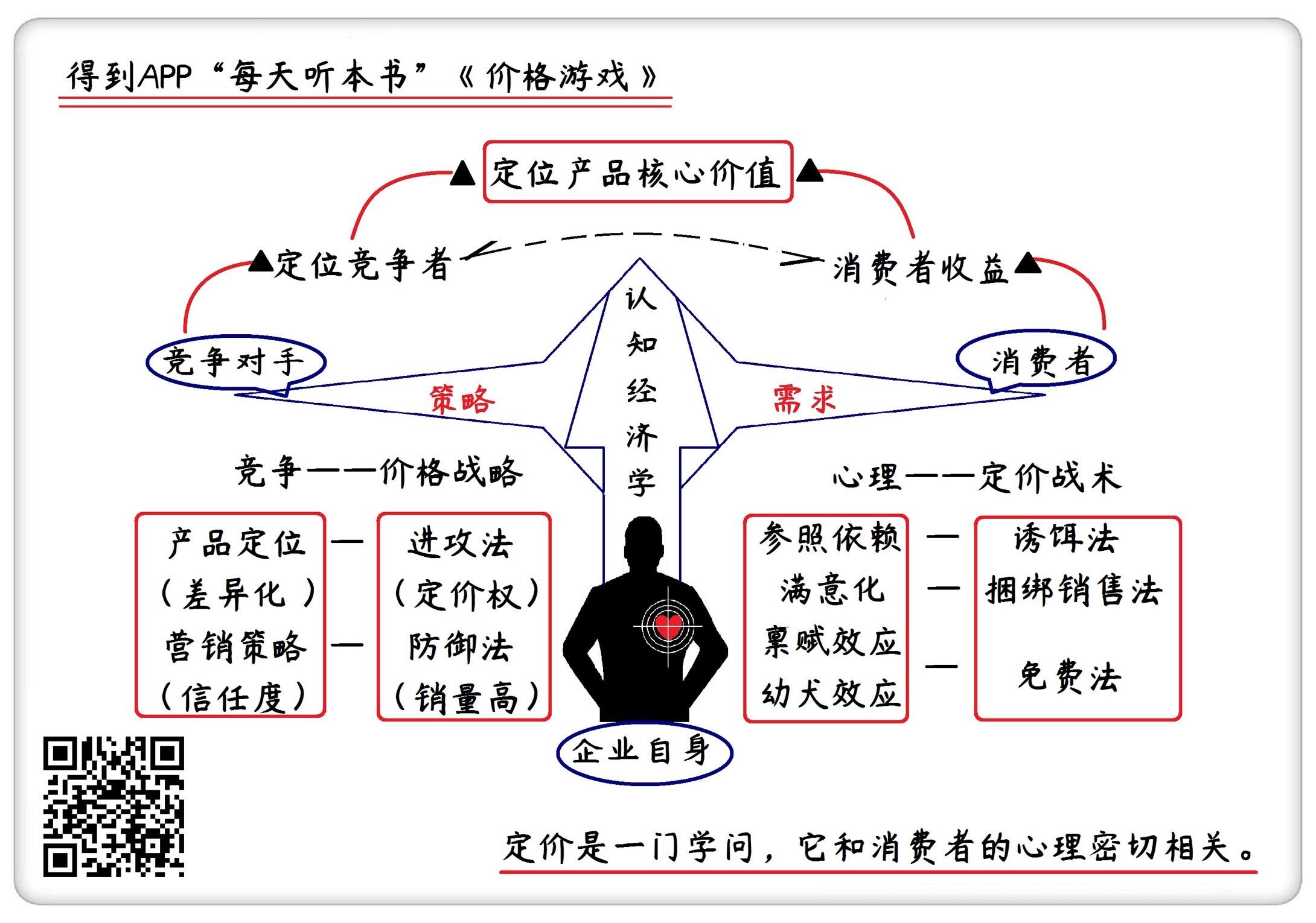 首先我们要了解,定价的含义是什么?为什么说定价不是从企业角度出发,把成本和利润相加就可以了,还要从消费者角度出发,根据产品带给消费者的价值来定价?接下来我们再看,从消费者心理来定价,有哪些常用的定价技巧?最后,作者告诉我们,企业在价格游戏中,应对竞争对手的价格战有哪些方法?