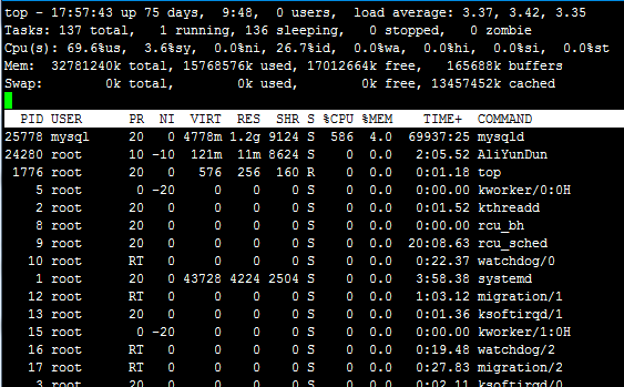 先使用top确定一下服务器上消耗内存最大的进程,确定没有其他程序的影响: