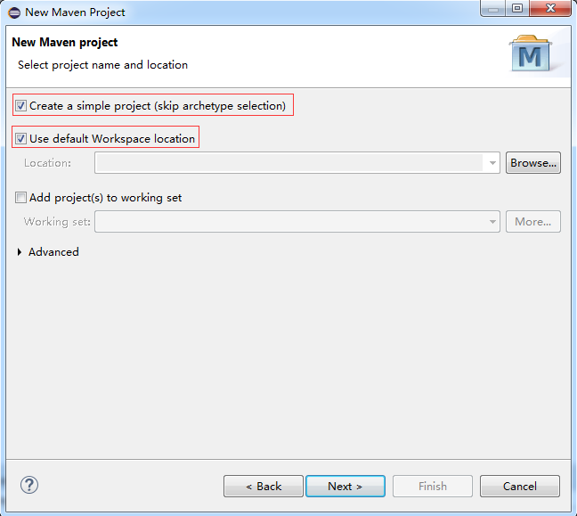 第四步、在New Maven Project向导中,选择Create a simple project然后单击Next,默认工作空间就勾选use default workspace location,如果需要自己指定就去掉勾选再browse选择: