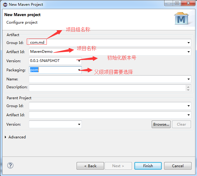 第五步、填写完成上面的GAV(groupId, artifactId, version)之后点击Finish后一个java maven父级项目就创建完成了