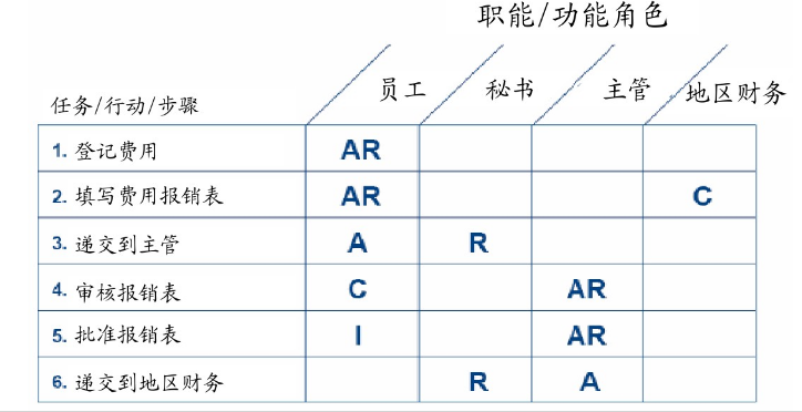 每一个流程中涉及人员的关系,如汇报、征求意见、指导执行、执行等关系都通过R、A、C、I的标定体现了出来。然而,每个子流程中的R、A、C、I自成一单元,不同子流程中的R、A、C、I不能体现其关系。此时作用范围扩展到人与人的关系。