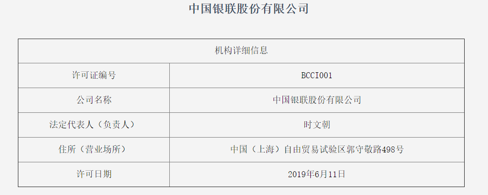 中国人民银行向中国银联颁发银行卡清算业务许可证