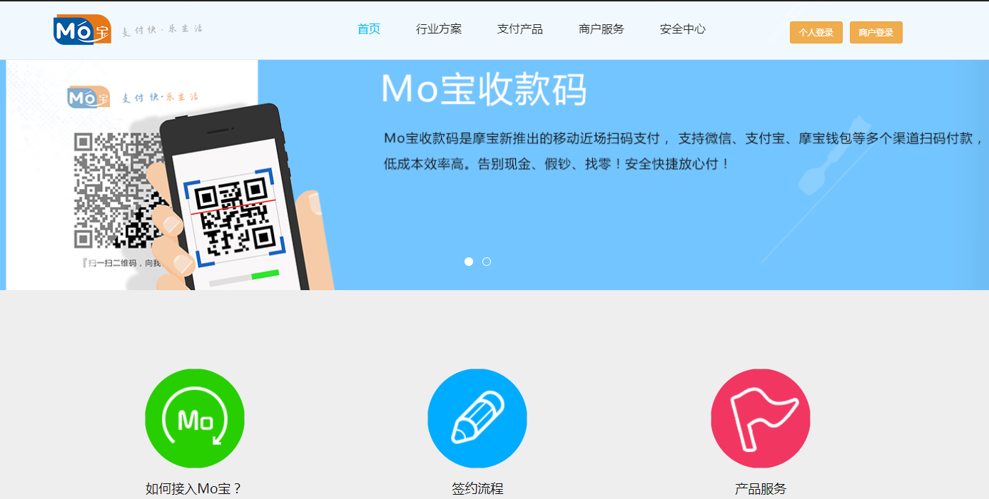 个人用户注册Mo宝支付后,不但可以在多家购物网站轻松进行购物,还可在Mo立方及1000多家线下商户实现手机支付。Mo宝支付支持全国各大银行的网银支付,用户也 可以先充值到Mo宝账户,享受更加便捷的Mo宝账户余额支付体验。针对企业用户,Mo宝支付构建全新的综合支付平台,业务覆盖B2B、B2C和C2C各领域,提供卓越的线上和线下支付及清算服务。