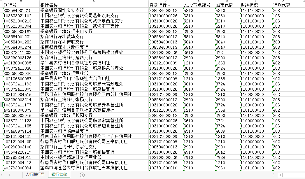 sheet1上有联行号、法人行号,sheet2如下图: