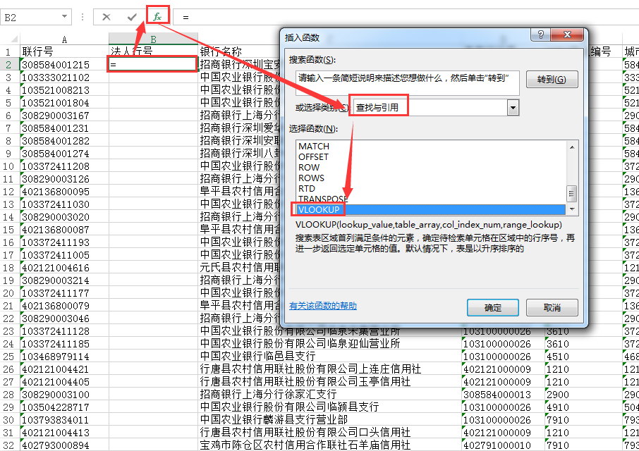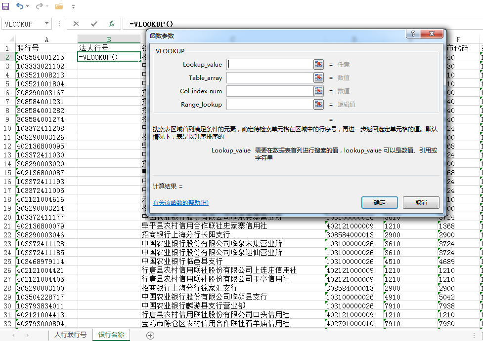 1、第一个输入参数Lookup_value选择要在表格中查找的数值 , 必须在表格数组第一列中查找的数值,Lookup_value 可以为数值或引用。例如这里我在2个表格中使用联行号作为Lookup_value的值,表示关联查询的主要条件;