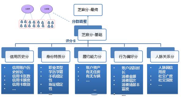 芝麻信用评分模型主要是侧重电商,是蚂蚁金融生态体系的重要环节。以芝麻信用所构建的信用体系来看,芝麻信用分根据当前采集的个人用户信息进行加工、整理、计算后得出的信用评分,分值范围是 350 到 950,分值越高代表信用水平越好,较高的芝麻分可以帮助个人获得更高效、更优质的服务。 芝麻分综合考虑了个人用户的信用历史、行为偏好、履约能力、身份特质、人脉关系五个维度的信息,其中来自淘宝、支付宝等“阿里系”的数据占 30-40%。