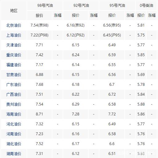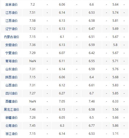 浙江92汽油6.14,95汽油6.53。安徽92汽油6.13,95汽油6.59。福建92汽油6.14,95汽油6.55。江西92汽油6.13,95汽油6.58。山东92汽油6.14,95汽油6.59。河南92汽油6.16,95汽油6.58。湖北92汽油6.17,95汽油6.60。湖南92汽油6.12,95汽油6.51。广东92汽油6.18,95汽油6.70。广西92汽油6.22,95汽油6.72。海南92汽油7.28,95汽油7.72。