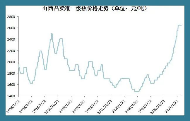 山西吕梁准一级焦价钱报2650元/吨,较去年同期上调940元。