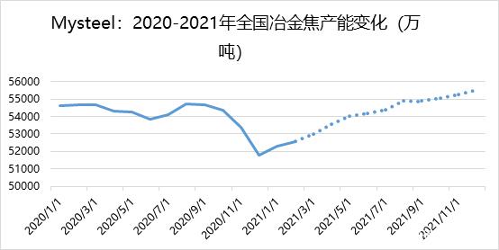 因而,综合来看,估计今年在无政策调控下,钢厂主动减产可能性较小,铁水产量将维持高位。Mysteel测算2021年全年铁水产量同比将增加约2300万吨至9亿吨左右,也就是冶金焦需求将增加约1000万吨,焦炭供需增幅差为500万吨(供给增幅-需求增幅)。