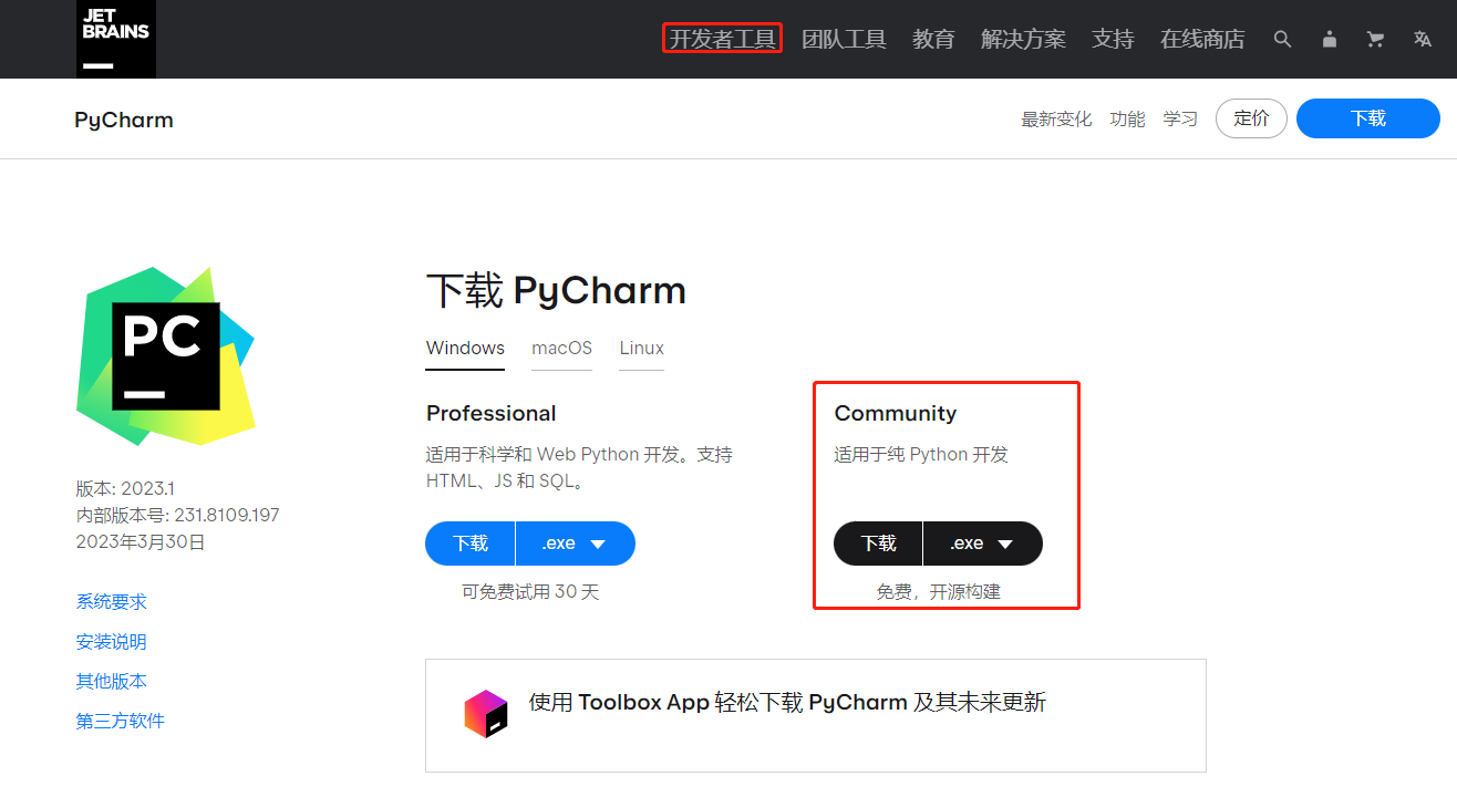 1、进入官网:https://www.jetbrains.com.cn/pycharm/download/#section=windows