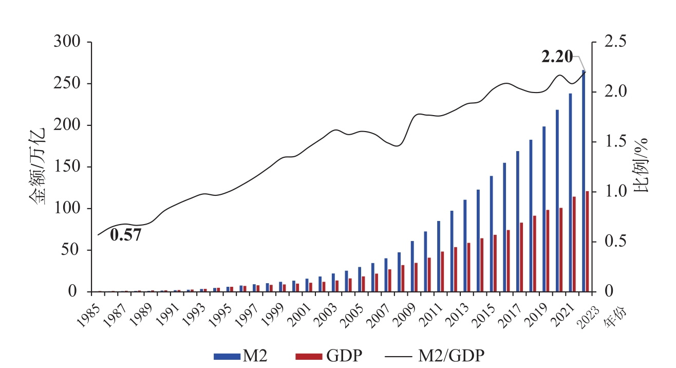 图1-7 我国1985—2023年的M2、GDP数据及其比例