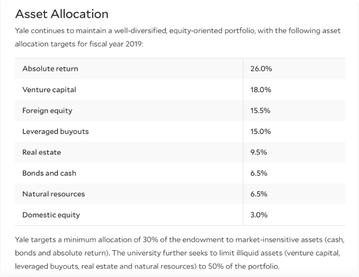 下图是来自耶鲁大学官网对基金在2019年大类资产配置的目标,你可以看到绝对回报(Absolute return,26%,这里主要指的是对冲基金)、风投(Venture capital,18%)、杠杆收购(leveraged buyouts,15%是私募基金的一种)这三项投资就占到了整个基金的60%。